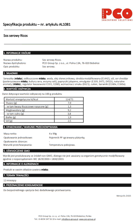 Oryginalny sos serowy Ricos jest dostępny w zestawie czterech sztuk po 99 g, co łącznie daje aż 396 g wysokiej jakości dipu.