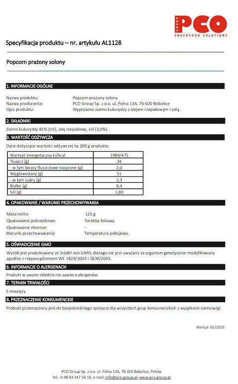 Popcorn solony jak z kina od Crunchy Snack to więcej niż tylko przekąska. To sposób na stworzenie wyjątkowej atmosfery w każdym miejscu i czasie. Nie zwlekaj! Zamów nasz popcorn solony, prażony tradycyjnie, przygotowany na oleju rzepakowym i pozwól swoim kubkom smakowym na prawdziwą ucztę. Przygotuj się na smakową podróż, która dostarczy Ci radość i satysfakcję. Kup teraz i delektuj się wyjątkowym popcornem, który spełni Twoje oczekiwania!