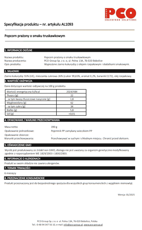 Niezwykłe doznania smakowe, które oferuje słodki popcorn o smaku truskawki, to prawdziwa uczta dla kubków smakowych. Każdy kęs tego przysmaku to połączenie chrupkości i delikatności, które sprawia, że trudno się od niego oderwać. Gdy tylko otworzysz opakowanie, intensywny aromat truskawkowy zaczyna pobudzać zmysły, zapowiadając wyjątkową podróż smakową. Delikatnie prażony na oleju rzepakowym, popcorn truskawkowy zachwyca nie tylko swoją teksturą, ale przede wszystkim doskonałym balansem między słodyczą a subtelnym smakiem truskawek. To właśnie ta harmonia sprawia, że jest to produkt idealny na każdą okazję - od wieczorów filmowych po spotkania w gronie przyjaciół. Słodki popcorn o truskawkowej nucie to coś więcej niż przekąska; to doświadczenie, które łączy smakowitą słodycz z chrupiącą przyjemnością. Niezwykle zadowalająca kompozycja, jaką prezentuje popcorn truskawkowy, zasługuje na szczególne miejsce w kategorii słodkich przysmaków, dostarczając niezapomnianych wrażeń przy każdym kęsie.