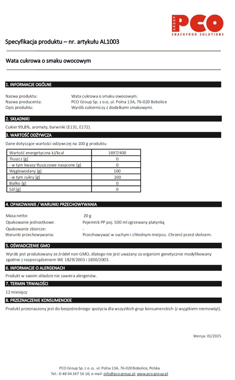 Wata cukrowa kolorowa dostępna w naszym sklepie, to świetny wybór na różne przyjęcia, czy imprezy okolicznościowe. Doskonale sprawdzi się także podczas wieczoru filmowego, organizowanego w domu. Połączenie smaków daje zaskakujący efekt, który z pewnością zachwyci każdego, kto uwielbia takie przekąski. Produkt przeznaczony jest do spożycia dla każdego, zarówno dorosłych, jak i dzieci. Co więcej, nie zawiera on alergenów. Owocowy smak waty cukrowej zachwyci także najmłodszych.